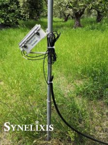 One SynField Head Node (HB) drives two METER Environment EC-5 soil moisture sensors measuring the need for irrigation, while the SynControl cloud application provides advise for irrigating more than 500 olive trees in a field of more than 20.000 m2.